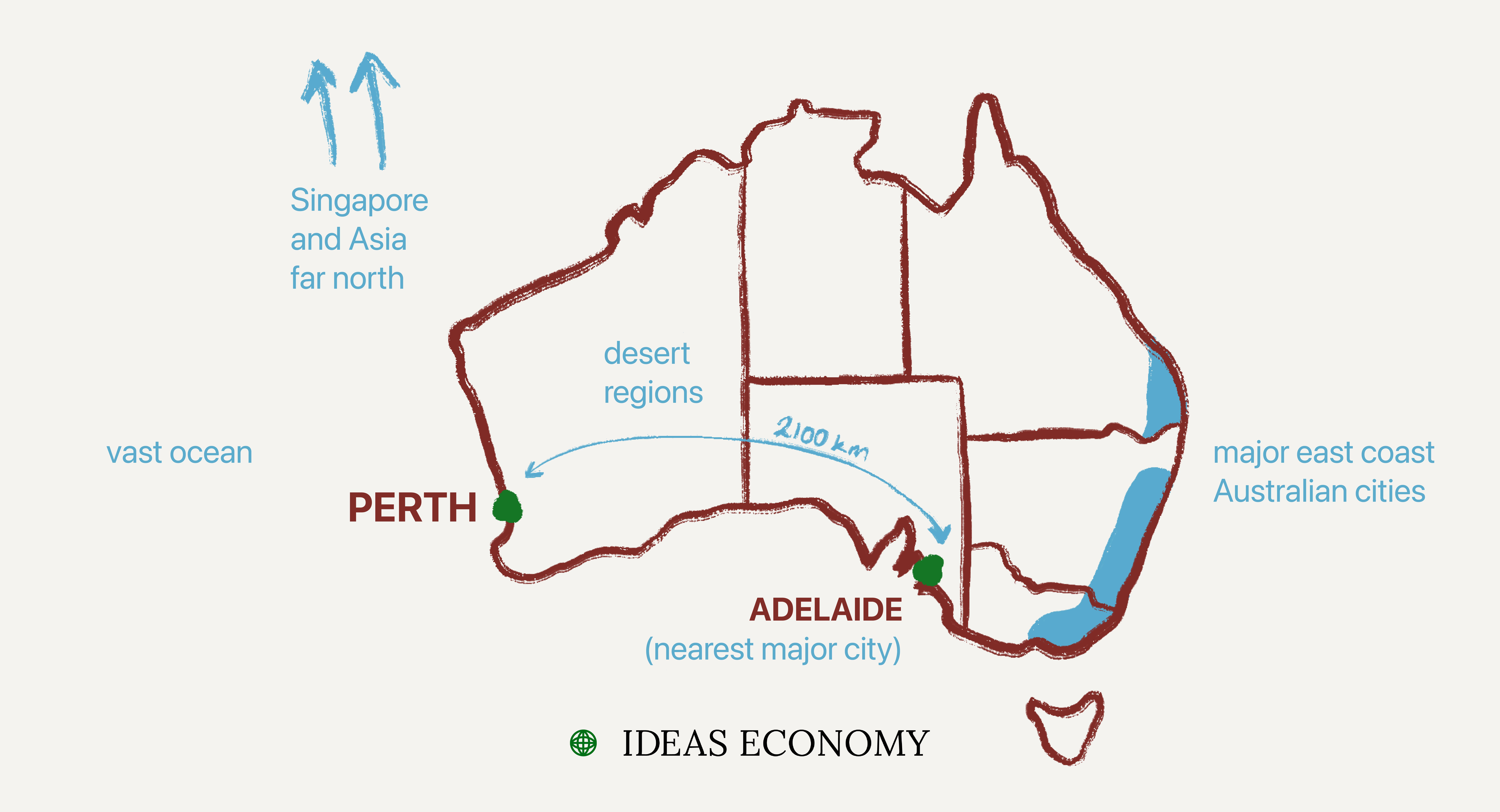 Perhaps the best exemplar of this is Australia’s own sunny Perth. Once a sleepy mining and resources town, Perth is evolving faster than its collective identity can process. Out of all global Beta cities, it is the most geographically isolated. It is surrounded by ocean to its west, desert to its east, and its nearest major city, Adelaide, is about 2,100km away (approx. 1,300 miles). Perth is the world’s largest globally-connected city that is also absurdly far from almost anything else. And it is here that we see our common Beta-city dynamics most exaggerated.