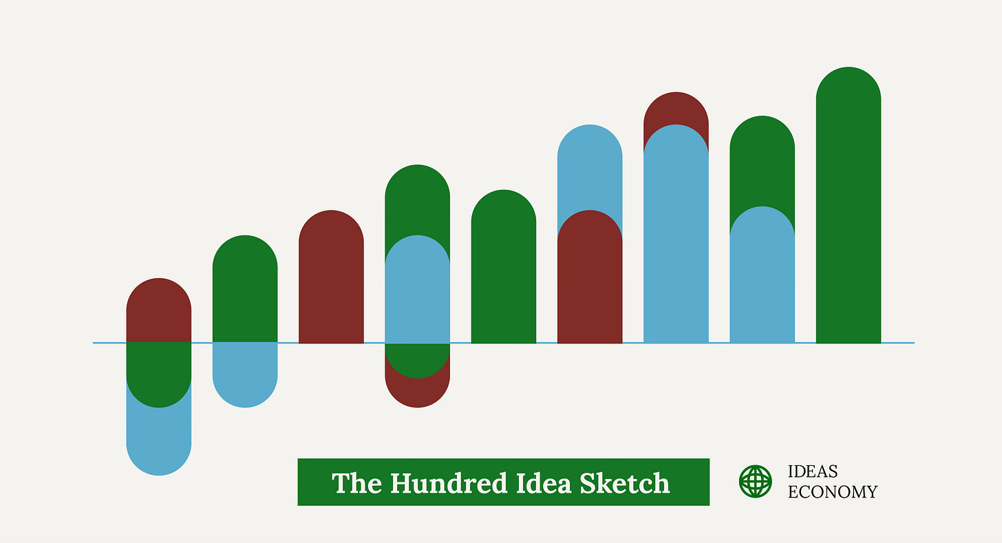 Key idea: Most people ideate within a ‘safe zone’; typically the first 5-10 ideas. These are often uninspiring and tired. Novelty emerges when you push past the comfort zone into the 20-50-100-ideas range, where ordinary ideas begin to mutate, blend, and transform into weird, delightful, and unexpected forms.